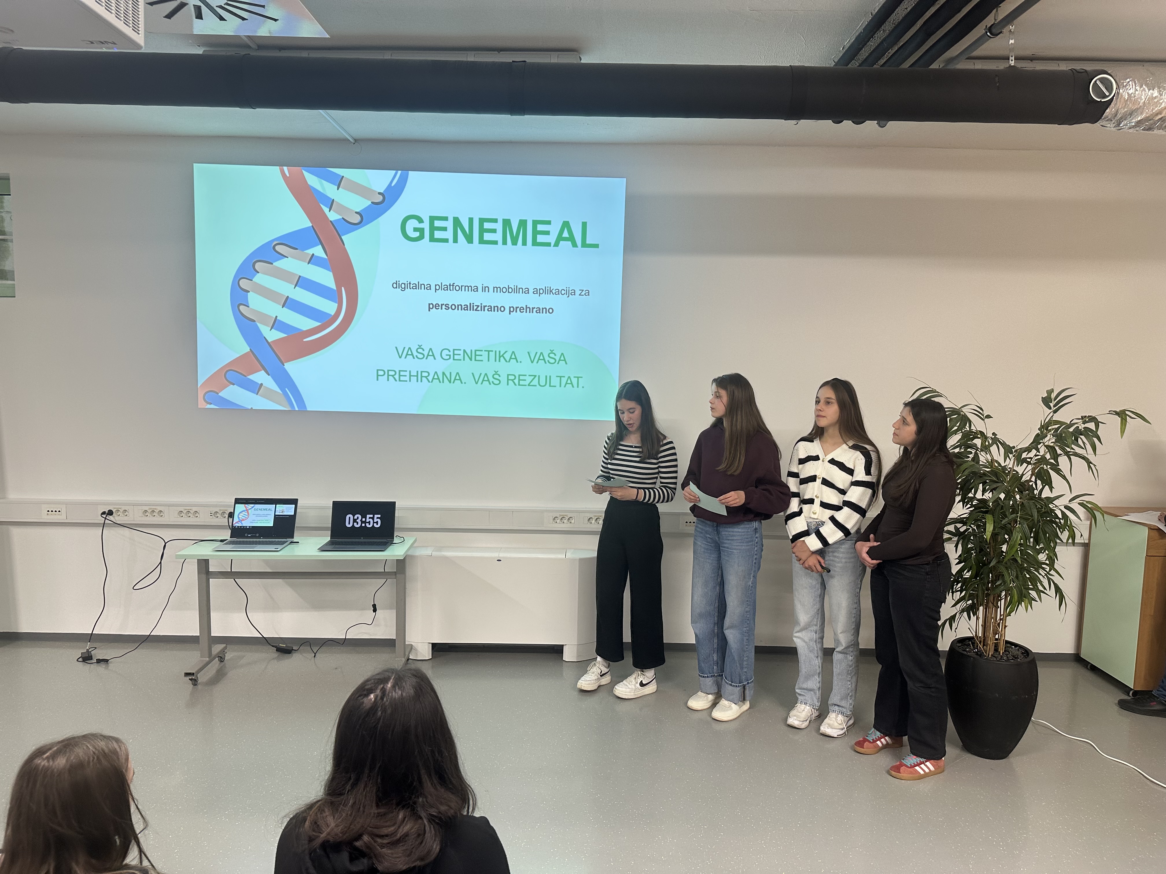 Na naše učence smo izjemno ponosni, saj so s svojo udeležbo dokazali, da imajo veliko idej, energije in podjetniškega duha. Še posebej pa so se izkazale Sara, Nina, Jana in Maruša z GeneMeal, ki so se uvrstile med najboljše tri ekipe tekmovanja in si s tem pridobile pravico udeležbe na državnem tekmovanju, ki bo meseca aprila potekalo v Novi Gorici, hkrati pa so osvojile tudi nagrado v višini 500 €, ki jo bomo lahko uporabili za realizacijo nadaljnjih aktivnosti zmagovalne poslovne ideje. Pri GeneMeal gre sicer za digitalno platformo, ki na podlagi DNK analize posamezniku predlaga prehrano, prilagojeno njegovemu telesu, podjetje pa tudi omogoča nabavo prehranskih paketov, ki so prilagojeni posamezniku.